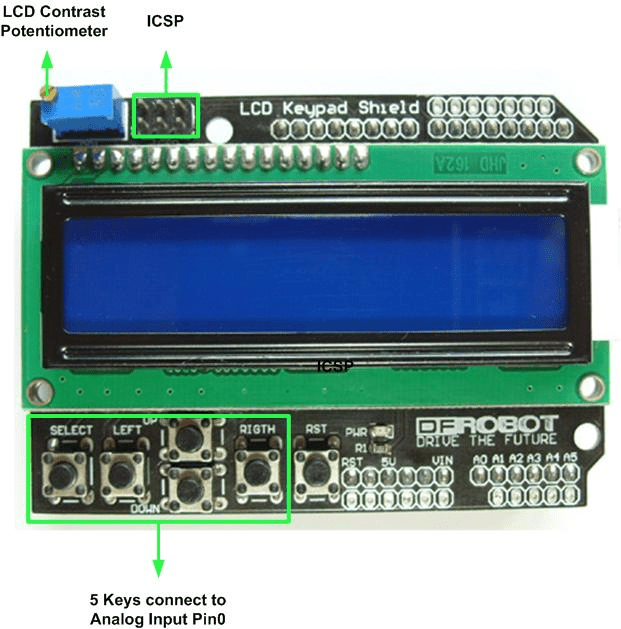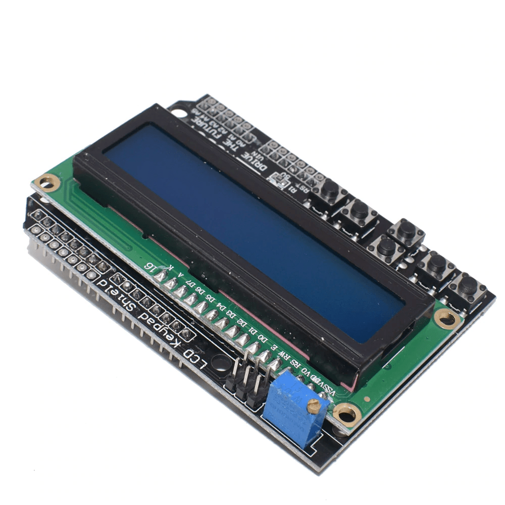Integrated Components: The shield often includes additional components such as potentiometers for adjusting contrast, backlight control for the LCD, and sometimes even additional circuitry for interfacing with the LCD and keypad.