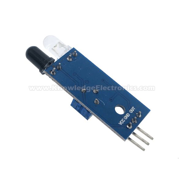 The IR Proximity Sensor has a pair of infrared transmitter and receiver tube. The infrared light emitting diode emits a certain frequency. So, when it encounters an object, it reflects from the surface of object. The IR receiver diode, senses the reflected IR light. The signal from IR receiver diode is fed into a comparator circuit, which will provide output to the MCU.